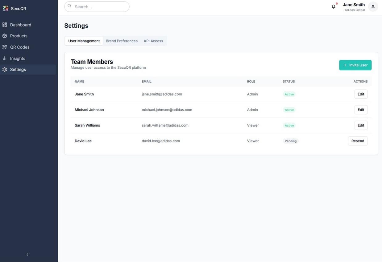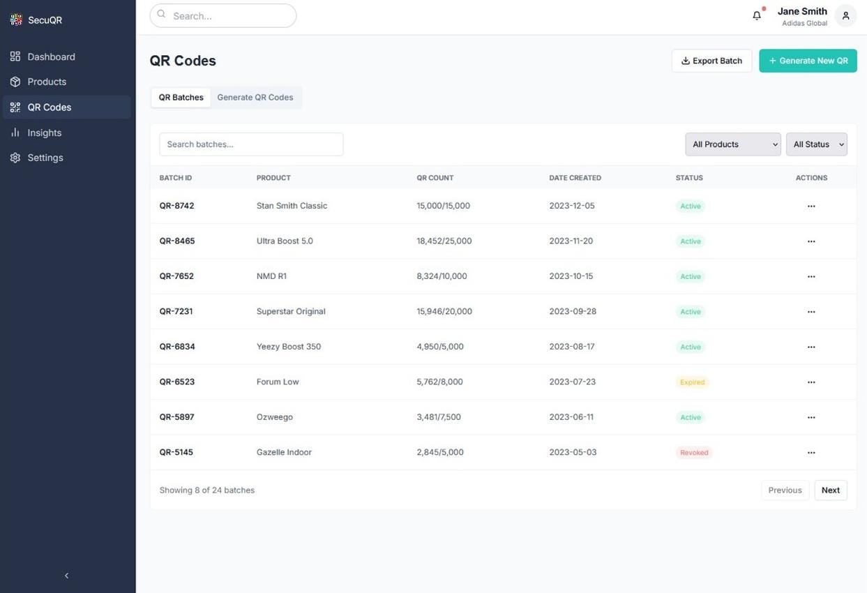 The dashboard is where brands manage products, QR batches, and scan activity.