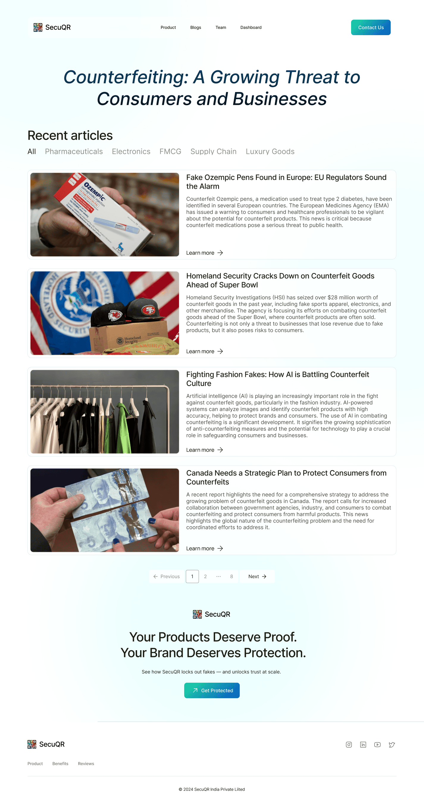 The content hub frames SecuQR not just as a product, but a voice in the anti-counterfeit space. Tabs by category (Pharma, FMCG, Electronics, etc.) position it as a thought leader with market awareness.